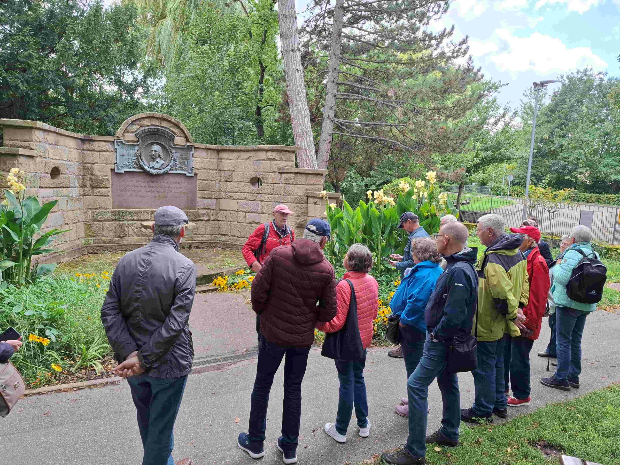 Am Parkplatz zwischen Hölderlin-Kunstwerk und Hölderlinhaus traf sich die Gruppe des Regionalverbandes Ludwigsburg zu einer Erlebnisführung. Der Stadtführer Klaus Koch erläuterte an einer Karte die Gliederung der Stadt Lauffen, bestehend aus drei Teilbereichen Lauffen Dorf, Lauffen Stadt und dem Klosterhof.