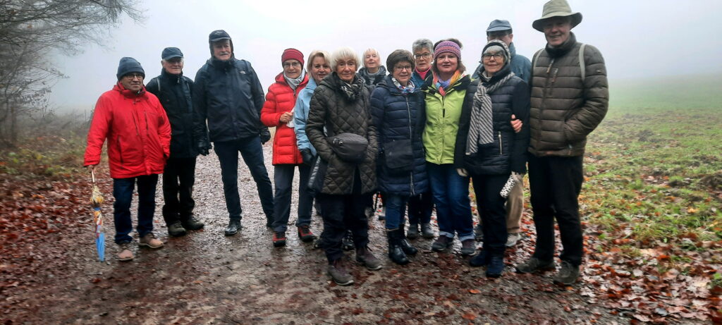Die Anfahrt zum Parkplatz bei der Schwanner Warte war wegen Bauarbeiten und Sperrung des Kreisels an der Hauptstraße kompliziert, aber alle meisterten die Strecke durch das Wohngebiet bravourös. Pünktlich um 10 Uhr ging es auf die 5 Km lange Strecke, zuerst durch den Wald. Matschig war der wegen Baumfällarbeiten und vorausgegangenem Regen aufgeweichte Weg. Am Panoramaweg in Conweiler angekommen gab es außer dem Nebel nichts zu sehen. Der sonst erhabene Ausblick auf das Pfälzer Waldgebiet, das Kraichgau oder den Odenwald blieb der Gruppe versagt.